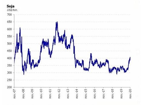 Miren éste cuadro con la evolución del precio de la Soja en los últimos años, para graficar lo antedicho: