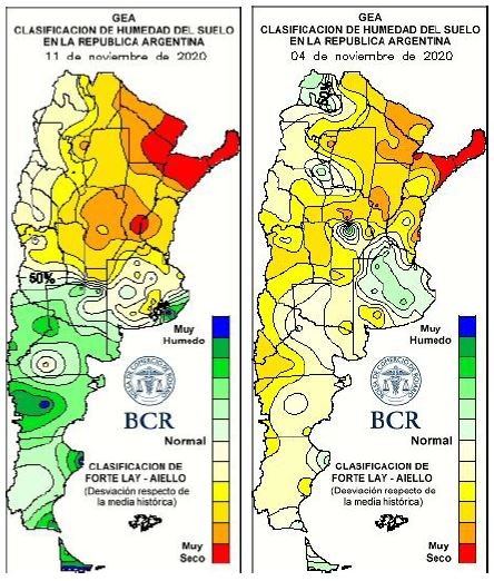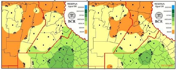 Pero la condición de sequía “escasa” aumentó y domina sobre el 52% de la región núcleo al comparar la situación actual (derecha, 19/11) con la de la semana pasada (izquierda, 12/11).
