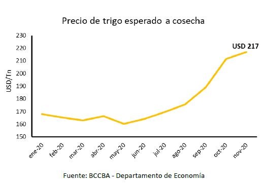 Por otro lado, el precio del trigo se incrementó en los últimos meses, lo que podría aliviar la situación en términos agregados. Al comienzo de la campaña 2020/21 se esperaba un precio de trigo a cosecha de USD 164 por tonelada, valor que actualmente se ubica en USD 217/tn. Es decir, el precio esperado aumentó un 32% desde junio, y sería un 29% mayor al precio de cosecha de la campaña previa, lo que permitiría recuperar, en parte, el valor perdido por la menor producción.