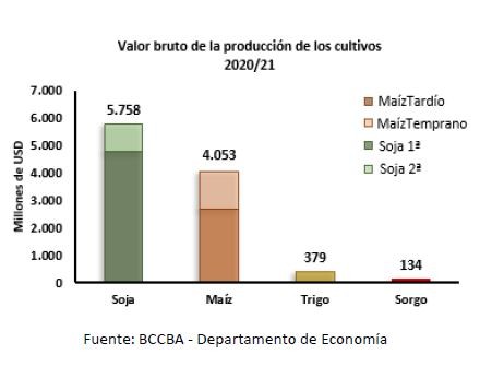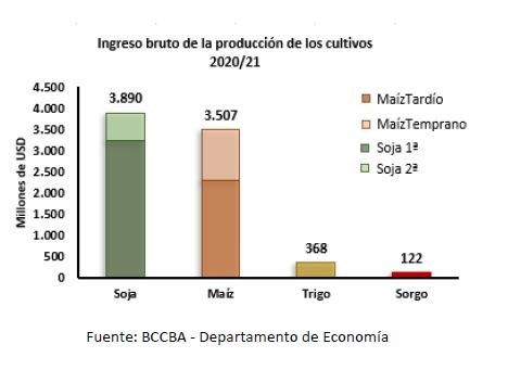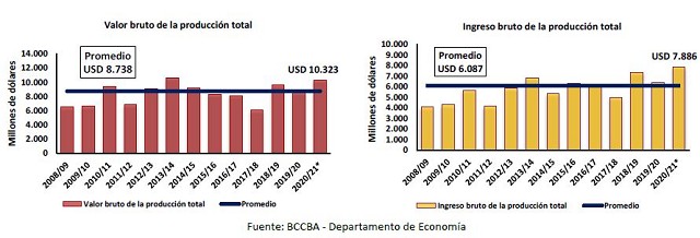 Con estos valores en consideración, se estimó el valor bruto e ingreso bruto de la producción que e l sector agrícola generaría en la campaña 2020/21.