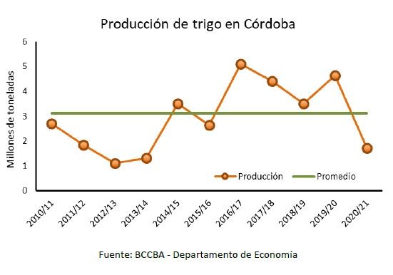 Por otro lado, la estimación del rendimiento promedio se ubica en torno a los 17 quintales de trigo por hectárea para Córdoba, lo que es 11 quintales por debajo del promedio de las últimas diez campañas, y destaca como el valor más bajo luego de la campaña 2008/09. La suma de un rendimiento por debajo del promedio y una menor área cosechada resulta en una producción de 1.728.000 toneladas de trigo, 63% por debajo de la producción de campaña previa y 45% menor al promedio de las últimas diez campañas.