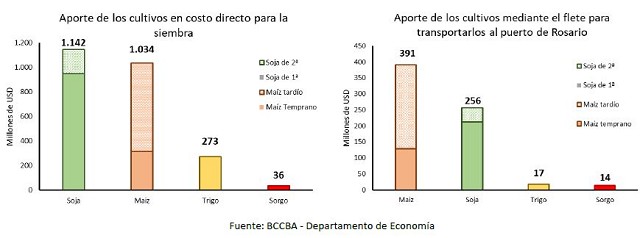 Con respecto al costo en flete, la producción que se estima en 36 millones de toneladas requeriría alrededor de 1.200.000 viajes, de los cuales 950.000 serían hacia el puerto y 250.000 dentro de la provincia. El transporte implicaría un desembolso de USD 678 millones en concepto de fletes. De este total, un 38% sería consecuencia directa de la soja, mientras que el 58% correspondería al transporte del maíz, ya que su mayor volumen de cosecha por hectárea requiere un mayor servicio de flete, incluso a pesar de poseer un área sembrada equivalente al 60% del área sembrada con soja.