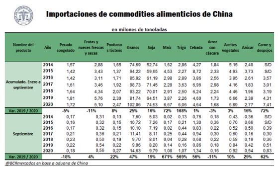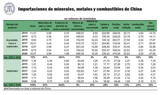Sin mucha notoriedad y con un impacto acotado en los cables de noticias, China ha incrementado de manera sostenida las compras de todo tipo de productos básicos en lo que va del 2020. Esta aceleración de las importaciones del gigante asiático se ha hecho más fuerte en los meses de septiembre y octubre. Si tomamos el acumulado anual hasta septiembre, para el cual se cuenta con datos detallados, las importaciones en ciertos rubros son récord a pesar de la pandemia de COVID-19. Se puede notar un incremento generalizado en las importaciones de todos los commodities, incluidos los minerales, metales y combustibles (carbón, cobalto, mineral de hierro, petróleo) y gran parte de los productos alimenticios que suele importar en pequeñas cantidades, durante las últimas semanas y meses.