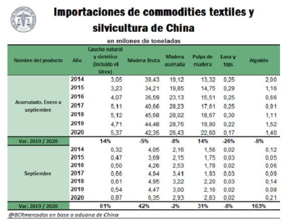 En el sector de productos de silvicultura y textiles, la potencia industrial asiática ha aumentado sólo sus compras de caucho y pulpa de madera. En el acumulado del resto de los productos se registran caídas de entre 5% y 26%. Aun así, se registró un importante aumento en las importaciones del mes de septiembre en casi todos los rubros. En los resultados preliminares de octubre se observa el mismo incremento anual.