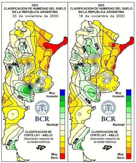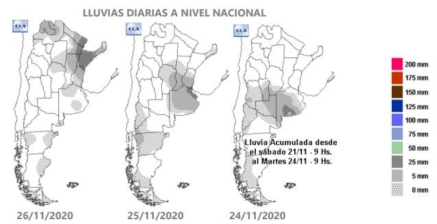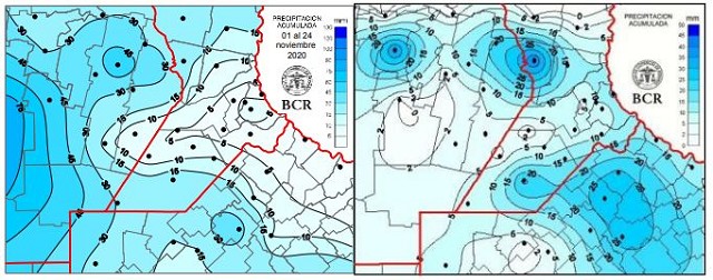 En noviembre la región núcleo suele recibir entre 100 y 120 mm. Pero en este 2020, en lo que va de noviembre, el promedio de las lluvias acumuladas en las 36 estaciones de la región es de tan solo 35 mm. O sea, llovió solo el 31% de la media mensual. Esto es una señal de mucha preocupación para el sector, aparte del golpe de calor que mantuvo a principios dela semana que marcó máximas de 36 a 43°C en la región. Al 24 de noviembre, ya transitando la cuarta semana del mes, el 20% de la región núcleo, en todo el mes, mostraba lluvias acumuladas que ni siquiera totalizaban los 10 mm. Por suerte hubo un evento de lluvias que se concretó el 25/11, el de la imagen de la derecha, algo muy positivo para la siembra de soja en el este de la región núcleo. Ese evento dejó lluvias de 20 a 30 mm en el castigado NE bonaerense. Aparte, en Montes de Oca hubo un núcleo aislado de 40 mm y en Hernando otro de 39,2 mm. Pero en el 47% del resto de la región las lluvias fueron inferiores a los 10 mm.