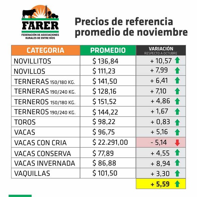 La Federación de Asociaciones Rurales de Entre Ríos (FARER) confeccionó el informe mensual de precios de referencia del ganado vacuno a partir de los datos recolectados en las firmas consignatarias de la provincia.