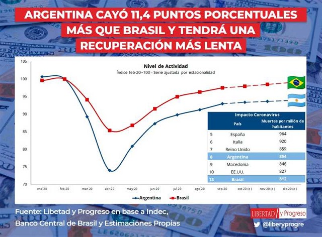 La Pandemia ha afectado a todas las economías del mundo en mayor o menor medida. Argentina se encuentra entre las diez economías que más caerán este año producto de la Pandemia, pero también de una cuarentena prolongada. Otro contraste nos muestra Brasil, donde la caída fue mucho menor y la recuperación más rápida. El argumento sanitario de una prolongada cuarentena tampoco es indicativo de la situación nacional. En Argentina la cantidad de muertes por millón de habitantes es de 854 versus 812 en Brasil.