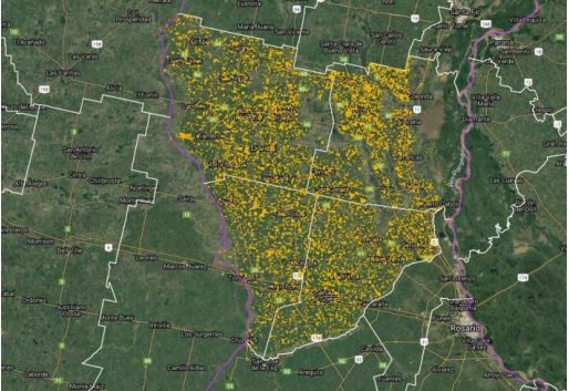 San Martín, San Jerónimo e Iriondo. Se tomaron 500 puntos georreferenciados y tal como se hizo el año pasado —procesamiento con Google Earth Engine y clasificación mediante un script extrayendo imágenes del satélite Sentinel-2— se determinó 251.147 ha cultivadas con trigo en este año. El ciclo pasado los satélites mostraron 330.00 ha con lo que se estimaba, hasta hace una semana, solo una baja de un 6%, es decir 310 mil ha. Pero el ajuste resultó mucho más importante, se sembró casi un 25% menos que el año pasado. ¿Puede haber más ajustes negativos en la región? Sin dudas que el impacto de la falta de agua a la hora de siembra impactó a un mayor nivel de lo que se esperaba en Córdoba y Santa Fe. A nivel región núcleo, el trabajo satelital seguirá por el sur de Santa Fe. Por lo pronto las cifras de trigo se actualizan a 1,56 M de ha sembradas, y una producción que pasa de 4,17 a 4,07 Mt.