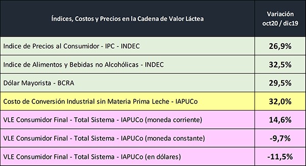 En el cuadro puede verse que en 2020 el ingreso por litro de leche equivalente en la cadena estuvo hasta octubre 12,3 puntos porcentuales por debajo del IPC, fue 17,9 puntos porcentuales inferior al incremento de precios de Alimentos y Bebidas no Alcohólicas y también la evolución de los precios de los lácteos fueron inferiores en 14,9 puntos porcentuales respecto de la evolución del tipo de cambio.