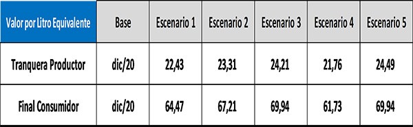 Partiendo de los números del mes de octubre (últimos publicados), donde el Valor Final de la Cadena fue de $ 57,15/litro equivalente o US$ 0,74/litro equivalente y el Precio al Productor fue $ 19,89/litro o US$ 0,256/litro (con una participación del 34,8% sobre el valor final o del 53,2% sobre el valor de salida de fábrica o precio al que vende la industria), se solicitó al IAPUCo que corriese sus modelos bajo las siguientes 5 hipótesis alternativas (escenarios):