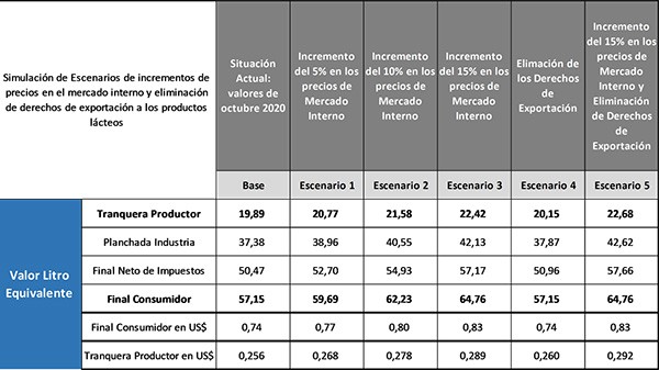 Como hipótesis complementaria, en todas las alternativas, se consideró que la industria pagara al productor un precio por litro de leche que represente el 53,2% del valor de salida de fábrica (VLE en Planchada) resultante. Adicionalmente, se consideraron los precios del resto de los factores en sus niveles del mes de octubre del 2020.