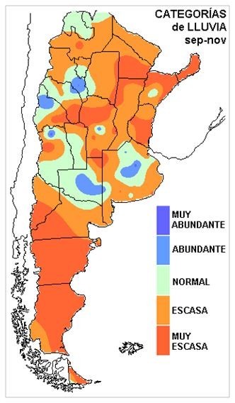 Es posible decir que el importante despliegue de esta anomalía negativa encuentra parte de su explicación en la presencia del fenómeno de La Niña, más aún cunando consideramos que esta deficiencia pluvial también afectó, dentro del mismo período a sectores de Paraguay, sur de Brasil y Uruguay. Sin embargo, como ya comentamos, la campaña ya venía con un arrastre de lluvias pobres desde el mes de febrero. Es decir los malos resultados de la fina en el centro oeste de la región pampeana, no se justifican solo por las magras lluvias de primavera, sino también por las exiguas reservas con que se ingresó al invierno, es decir, luego de un otoño con precipitaciones que no lograron recuperar la humedad consumida en la gruesa anterior.