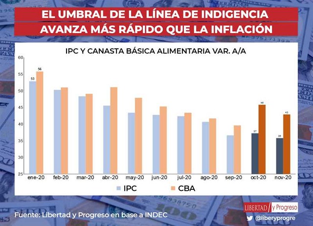 Por su parte, Diego Piccardo, Economista de la Fundación Libertad y Progreso sostuvo que “Es de vital importancia que esta tendencia se corrija, ya que la pobreza alcanzó el 44,2% para el cuatrimestre comprendido entre julio y octubre, y 6 de cada 10 chicos la padecen según los datos revelados por el Observatorio de Deuda Social de la UCA. En cuanto a la indigencia, ésta se ubica en el 10,1% y en el 16% en los niños y adolescentes. Tanto las personas en situación de pobreza e indigencia están más atentas a la CBA que al IPC, y preocupa sobremanera la evolución de la CBA en los últimos dos meses.”