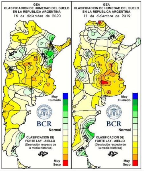 El año pasado hubo sequía pero la tecnología le puso un piso a los rindes trigueros y se reflejó con una producción récord de 19,5M de ha. Este año la sequía fue más que el esfuerzo del productor. Empezó limitando la siembra, ya que se sembraron 240 mil ha menos que en el 2019. Pero se fertilizó más y mejor con niveles récords. Sin embargo, la producción 2020/21 será un 15% menor hace un año; es decir que habrá 3 Mt menos. La nueva estimación de diciembre señala una nueva caída con 16,5 Mt.