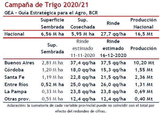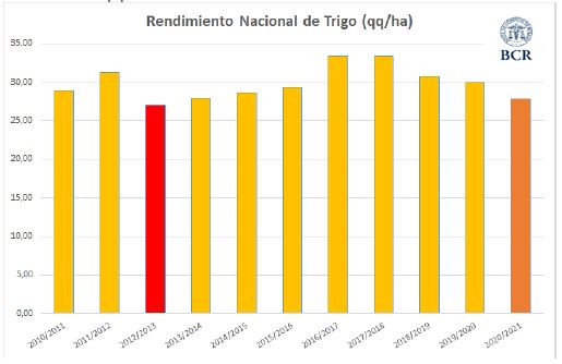 El guarismo tiene en cuenta 6,56 M ha sembradas con trigo y una pérdida de superficie de 600 mil ha. El rinde nacional pasa de 28,4 a 27,7 qq/ha, por lo que sería el segundo peor rinde nacional de los últimos 10 años. En el ciclo 2012/13, cuando el trigo se hacía con un paquete tecnológico que nada tiene que ver con el actual, el rinde fue de 27 qq/ha.
