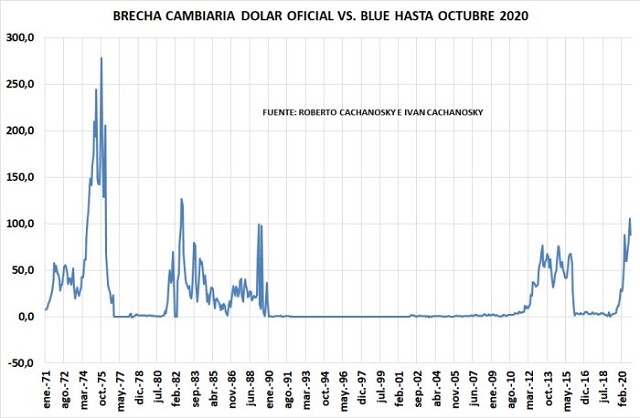 En valores constantes al mes de octubre 2020 el tipo de cambio blue se ubicaba en niveles cercanos a la hiperinflación de 1990 antes que se estableciera la convertibilidad.