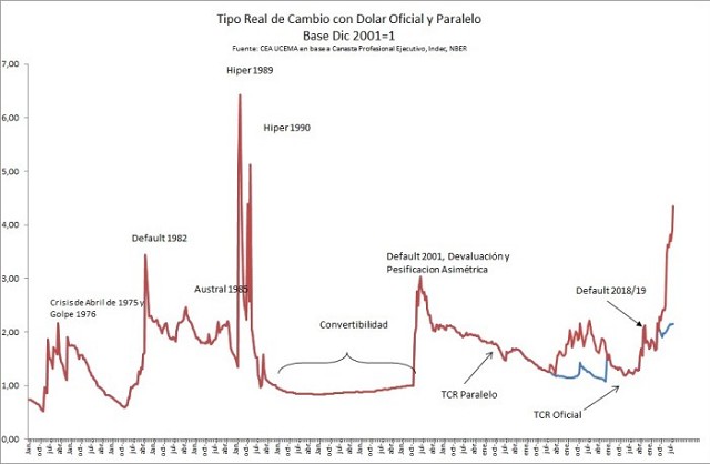 En el gráfico Mariano Fernández agrega el tipo de cambio oficial a partir del primer cepo cambiario en octubre de 2011 ni bien ganó las elecciones Cristina Kirchner.