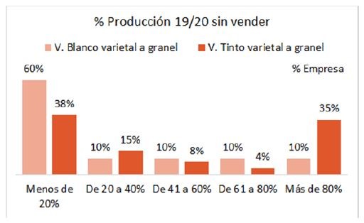 El 60% de las empresas que producen vino blanco varietal a granel y el 38% que producen vino tinto varietal a granel consultadas en este relevamiento, poseen menos del 20% de la producción de la última cosecha sin vender (excluidos los vinos de guarda). Esto implica una reducción de los stocks que se ve reflejado en los datos del INV (Instituto Nacional de Vitivinicultura): a noviembre, las existencias se contrajeron 21,5% y 12,9% en los vinos blancos y tintos varietales, respectivamente, de forma interanual. La razón principal sería la tracción de la demanda.