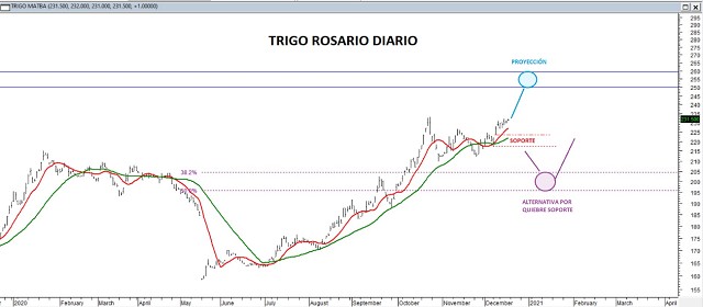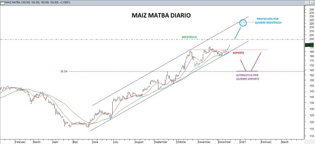 Este accionar advierte ante la posibilidad que el avance del cereal continúe extendiéndose de corto plazo, para buscar objetivos alcistas de 200 dólares. Más tarde un quiebre alcista de esa zona será necesario para liberar un camino de alza más importante, al menos con destino de 215-220 dólares; área por donde pasa la línea superior del canal alcista en desarrollo.
