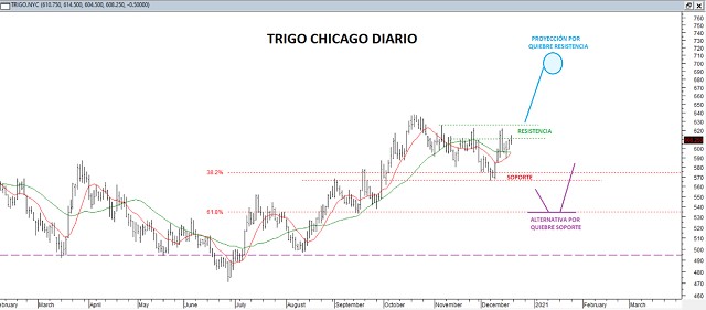 Esta recuperación del cereal tiene resistencia en la zona de en la zona alcanzada de 610-625 centavos. Con subidas por encima de esta zona estaremos confirmando que el piso correctivo ha sido conseguido y que el avance del cereal ha quedado retomado, en camino de llevar los precios por encima de máximos previos de 638.25 centavos, para buscar un acceso hacia instancias superiores para adelante en 680-700 centavos.
