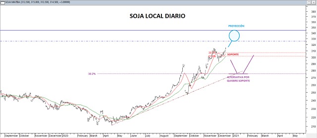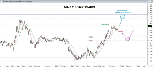 Este accionar advierte firmeza por parte del cereal y por ello creemos que en la medida que los precios se sostengan por encima de la zona de soporte en 420 centavos, estaremos advirtiendo ante un escenario de alza mayor, en camino de acceder por encima de los máximos de 439.5 centavos, buscando un regreso hacia la zona de 470-490 centavos, para quizás recién allí marcar un techo de mayor importancia al avance de los últimos meses y un recorte parcial mayor pueda habilitarse.