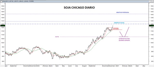 Importante reacción alcista del precio de la oleaginosa en la última semana, ha superado la zona de máximos y resistencia en 1180-1200 centavos, hasta alcanzar niveles de 1228.75 centavos. Este accionar advierte ante la posibilidad de continuaciones alcistas directas en el precio, con posibilidades de buscar la zona de 1250-1290 centavos, donde se concentra la siguiente resistencia de importancia. Más tarde, será necesario de un quiebre alcista de esa zona para que podamos evaluar un escenario de continuación ascendente de los precios hacia objetivos bastante más ambiciosos que se proyectan hacia los 1400 centavos.