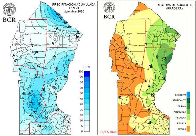 “Necesitamos agua en forma inmediata para no perder potencial de rinde. Creemos que ya se perdió algo, un 20% del área está en estado regular”, alertaban los ingenieros de Marcos Juárez hace una semana. Las reservas de agua para pradera permanente mostraban en el este de la franja central del país el mayor grado de desecación. Pero las tormentas que se desarrollaron entre el 17 y el 21 de diciembre acumularon de 30 a 60 mm en el 40% del territorio cordobés del lado este. En el sector oeste solo hubo de 10 a 15 mm. Las lluvias llegaron en el momento justo a una de las provincias más castigadas por la sequía que se ha extendido a lo largo del 2020. También se destaca el aporte clave de 30 a 40 mm en el sur de Santa Fe, que sufría una situación similar. Pero solo el 23% del territorio Santafesino contó con acumulados por encima de los 30 mm.