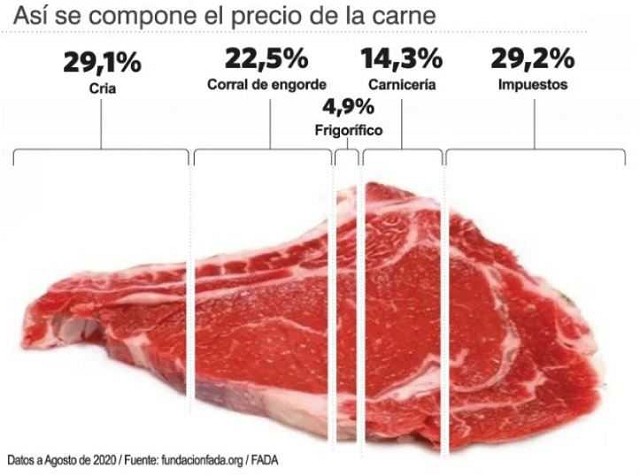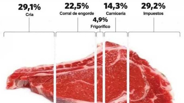 Los costos de la cadena representaron $251,50. Los impuestos sumaron $108,55 y el resultado de la cadena alcanzó los $11,83. De esos impuestos, el 76% son nacionales como el impuesto a las ganancias, IVA, e impuesto a los créditos y débitos, el 19% provinciales como el inmobiliario, ingresos brutos y el 5% municipales como impuesto a la industria y comercio y la tasa vial. A lo largo de la cadena, la etapa de la cría es la que más impuestos paga, seguido por el consumidor. Los mayores costos en las distintas etapas son: en el feedlot y en el frigorífico el animal, y en la carnicería la media res.