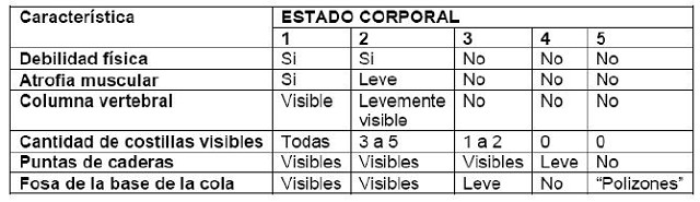 A continuación se presenta una tabla simplificada para una sencilla y rápida asignación de condición corporal.