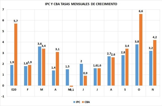 El gráfico 1 muestra la variación mensual del IPC y de la Canasta Básica Alimentaria (CBA) que marca la línea de indigencia. Como puede verse entre mayo y agosto el IPC aumentó más o igual que la CBA, pero a partir de septiembre la CBA crece mucho más que el IPC. En otras palabras, si a Macri lo criticaban porque se estaba metiendo con la heladera de la gente, Alberto Fernández directamente le quitó la heladera a la gente y, encima, la dejó sin trabajo con la eterna cuarentena.