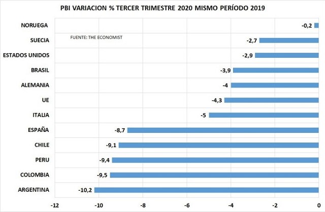 El argumento que podría dar el gobierno es que la pandemia tuvo la culpa de hacer caer el nivel de actividad, argumentando que eso pasó en todo el mundo, lo cual es cierto, pero, como puede verse en el gráfico 2, todos cayeron pero Argentina cayó mucho más tomando los datos del tercer trimestre del año.
