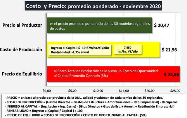 La diferencia entre el precio percibido y el precio de equilibrio es de $ 5,39 y US$ 0,068/litro de leche, alrededor de un 20% menos.