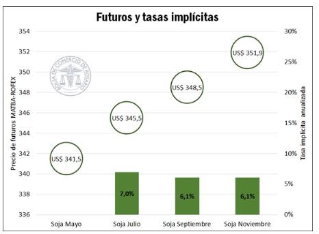 así, podemos analizar la tasa de carry entre la venta de soja para mayo y los
