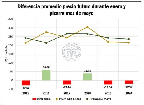 Analizando el contrato de futuros SOJ.ROS/MAY de cada año, podemos vislumbrar que, en 3 de las últimas 6 campañas, el máximo del contrato lo tocó entre febrero y mayo del año anterior a la cosecha. Es decir, la mejor oportunidad de fijación de precios, se dio en la mayoría de los casos un año antes de la fecha estimada de cosecha, y en muchos casos, previo a la decisión de siembra.