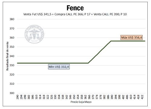 Ahora, puede uno preguntarse, ¿es conveniente dejar abiertas las ganancias potenciales hasta el infinito? Si la respuesta es no, podemos complementar esta estrategia con el lanzamiento de un CALL con un precio de ejercicio mayor al comprado; así, abaratamos el costo de nuestra cobertura, resignando ponerle un límite a los potenciales beneficios que obtendremos de la revalorización de la soja. Así, nace una estrategia llamada FENCE.