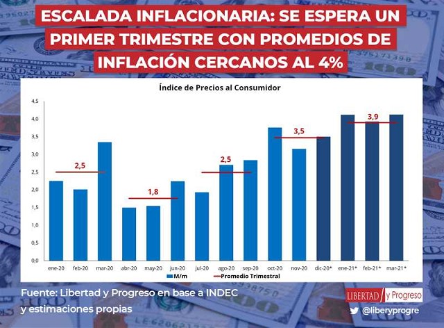 El 2020 cierra su último trimestre con una inflación promedio de aproximadamente el 3,5% mensual dejando un fuerte arrastre para el inicio de este año. En los próximos meses Argentina convivirá con altas tasas de inflación mensuales que promediarán el 3,9% en el primer trimestre del año. Esto complica aún más la economía agigantando el desafío de revertir el camino por el que transita el país.
