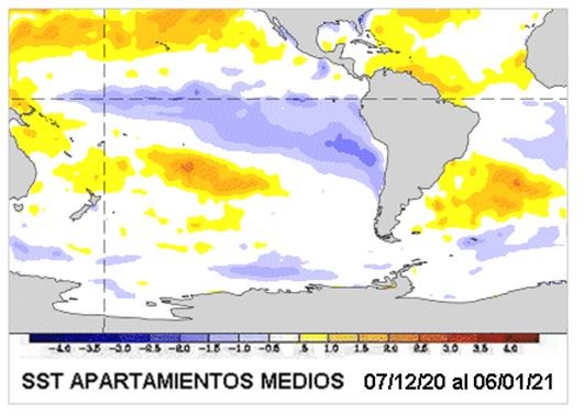 Respecto de comienzos de diciembre, se observa una importante calentamiento sobre el Atlántico, el mismo esta corrido hacia el interior del océano, pero es posible que finalmente el litoral brasileño y uruguayo, logren incorporarse a esta anomalía.
