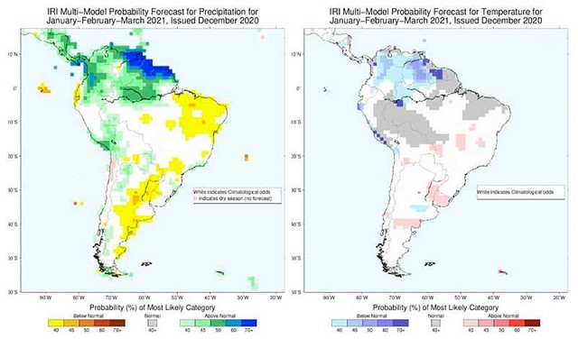 Nuevas estimaciones del Instituto Internacional de Investigación de Clima y Sociedad, de la Universidad de Columbia, en Estados Unidos, aportan datos sobre el comportamiento del clima para el próximo trimestre enero-marzo. Como es tradicional, las proyecciones se hacen mediante un mapa de precipitaciones y temperaturas (Foto 1).Los pronósticos de precipitaciones del periodo enero, febrero y marzo son consistentes en las conexiones esperadas de La Niña, advierten sobre una visión general del impacto de este fenómeno en el mundo. De acuerdo con las evidencias, está claro que las condiciones de lluvias por debajo de lo normal se mantendrán durante el verano y los indicios marcan que las condiciones secas se irán debilitando hacia el final del trimestre (International Research Institute for Climate and Socierty, 2020).