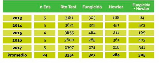 Cuadro 2: Rendimientos testigo y respuesta por tratamiento (Kg/Ha) en Soja. Promedios anuales 2013 a 2017.