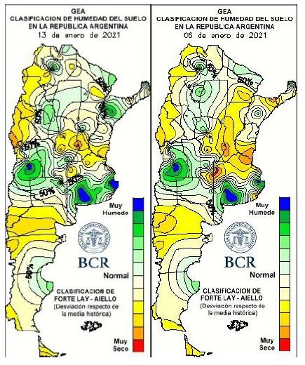 De las 400.000 ha en condiciones malas y regulares de la semana pasada, 250.000 se recuperaron y ahora son evaluadas como “buenas” gracias a las tormentas que se produjeron entre el 7 y el 13 de enero. Las zonas que aún siguen con severos problemas por la falta de agua son el sudeste cordobés y el norte bonaerense. Aparte, el 40% de los cuadros está muy bueno, tras las lluvias. Llegaron en el momento justo y evitaron el desastre que acechaba al llenado de granos de los maíces tempranos de la región núcleo. El 75% de los cuadros se encuentran en esta etapa, mientras que hay un 25%, ubicado en el sur de Santa Fe, norte de Buenos Aires y sudeste de Córdoba que todavía están en floración. Si bien la humedad del suelo ha mejorado, todavía faltan entre 100 y 120m milímetros para normalizar la situación. Pero estás lluvias han sido un auxilio estratégico para el cultivo. Y hay muy buenas chances de que la mejora continúe, los pronósticos indican nuevos desarrollos pluviales a partir del próximo viernes.