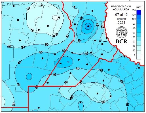 En los últimos 6 días el 85% de la región núcleo recibió lluvias que superaron los 30 mm. Clason, en Santa Fe, acumuló 90,6 mm, Maggiolo, en la misma provincia, marcó 71,2 mm y Canals, en Córdoba, registró en esos días 58 mm.