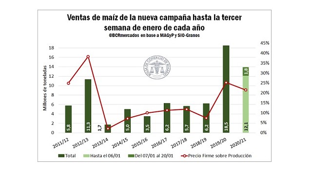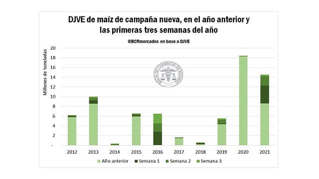 Asimismo, resulta remarcable que en lo que va de enero, el volumen declarado asciende a casi 6 Mt. Este es el segundo mayor monto anotado en las tres primeras semanas de enero de cada año, solamente superado por lo ocurrido en el 2016, cuando se declararon 6,4 Mt en igual lapso. Cabe aclarar que el gran volumen anotado en ese momento coincidió con la eliminación del sistema de ROE Verde para limitar los despachos del maíz así como también del cobro de derechos para exportación de maíz.