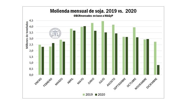 En tanto, la molienda de soja en Argentina continúa aletargada. La readecuación del esquema de derechos de exportaciones en favor del incentivo al procesamiento interno de la oleaginosa y el agregado de valor había comenzado a surgir efecto y en el mes de noviembre, por única vez en el año, el crushing superó el volumen del mismo mes del año anterior. Sin embargo, las interrupciones en la logística de descarga en plantas del mes de diciembre volvió a hundir el nivel de actividad y sólo se procesaron 808.184 toneladas, un 70% por menos que en diciembre de 2019. De esta manera, el 2020 cierra con un total procesado de 36 Mt, marcando una caída del 12,5% respecto del año anterior.