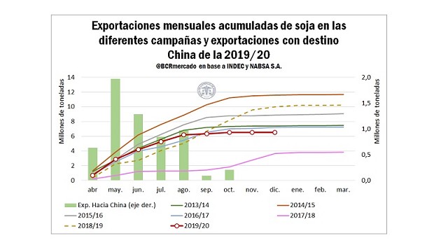 Analizando las exportaciones de soja para la corriente campaña, resulta llamativo que la exportación de estimada para este ciclo (6,8 Mt) se ubique un 34% por debajo de los envíos al exterior en la campaña anterior (10,2 Mt), considerando que la baja en la producción es sólo del 10%. En particular cuando se considera que en el mercado global, la demanda de la oleaginosa se ha mantenido sólida a lo largo del año, con China como principal comprador.