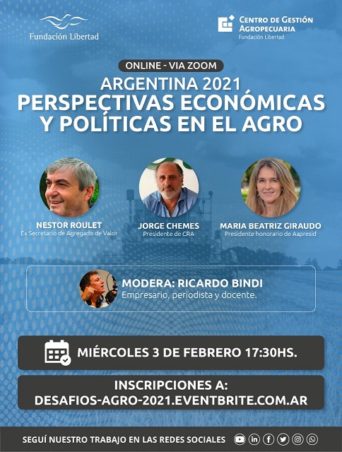 Éste miércoles 03 de febrero, Fundación Libertad -a través del Centro de Gestión Agropecuaria de su Escuela de Negocios- brindará una jornada virtual que contará con la participación de Néstor Roulet (ex secretario de la Nación), Jorge Chemes (presidente de CRA) y María Beatriz “Pilu” Giraudo (ex presidente de Aapresid). El encuentro contará con la moderación del periodista Ricardo Bindi (Agrositio y radio La Red).