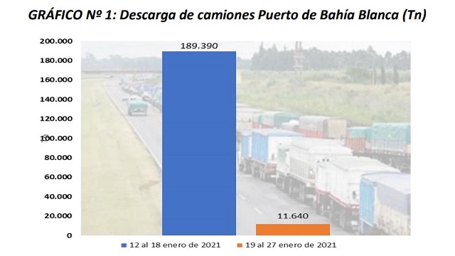 Al comparar la descarga de camiones desde el día mencionado hasta el 27/01, con la última semana de operatoria normal (12 al 18/01/21), se observa que el número de camiones se redujo en un 94% aproximadamente, pasando de 6.313 a 388 vehículos, lo que representó 177.750 Tn. menos.