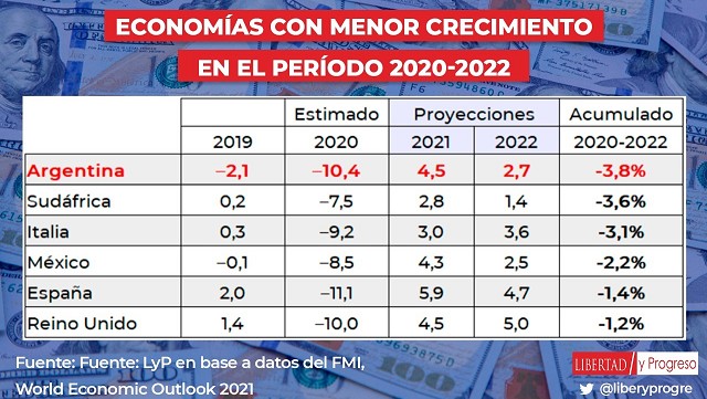 Las restricciones por pandemia afectaron significativamente a casi todo el mundo. A pesar de ello hay enormes diferencias. Algunos países sufrieron caídas muy superiores en sus PBI. En esta lista se encuentran los países desarrollados que en promedio arrojarían caídas del 4,9%, según el World Economic Outlook de enero de 2021 del Fondo Monetario Internacional. Argentina por su parte caería 10,4%, con el agravante de ser un país de ingresos medio-bajos. El organismo espera una caída acumulada del trienio 20-22, en -3,8%.