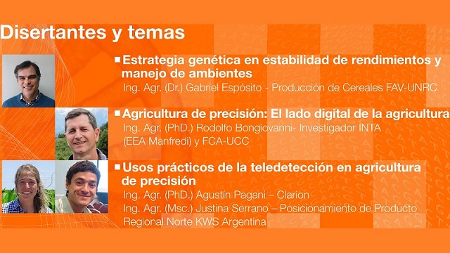 Durante este primer webinar, el Ing. Agr. Dr. Gabriel Espósito, docente de Producción de Cereales de la Univ. Nac. de Río Cuarto disertará acerca de estrategias genéticas en estabilidad de rendimientos y manejo de ambientes. A continuación, el Ing. Agr. PhD. Rodolfo Bongiovanni, investigador INTA Manfredi y de la Univ. Católica de Córdoba, presentará “el lado digital de la agricultura”.