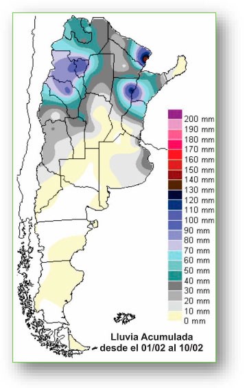 En el siguiente mapa mostramos las precipitaciones acumuladas en lo que va de febrero, desde el lunes 01 al miércoles 10 para todo el territorio nacional. Claramente toda la región norte del país fue la más beneficiada por los distintos eventos de lluvias. Sin embargo, es notorio las características de los mismos, puntuales, acotados y con falta de homogeneidad. Dentro de los valores máximos acumulados en el período comprendido se destacan S.M. de Tucumán con 110 mm, Reconquista - Santa Fe con 127 mm y, en el podio, Formosa Cap. con 149 mm. Cabe aclarar que, en esta primera parte de febrero, estas localidades ya superaron el valor medio esperado.