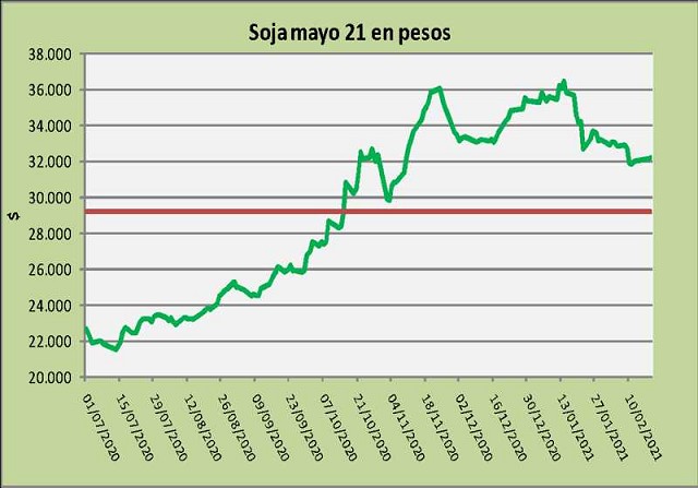 Con relación a la posición mayo en pesos, a través de la venta simultánea de soja y dólar Rofex la coyuntura arroja un valor cercano a $32.600.